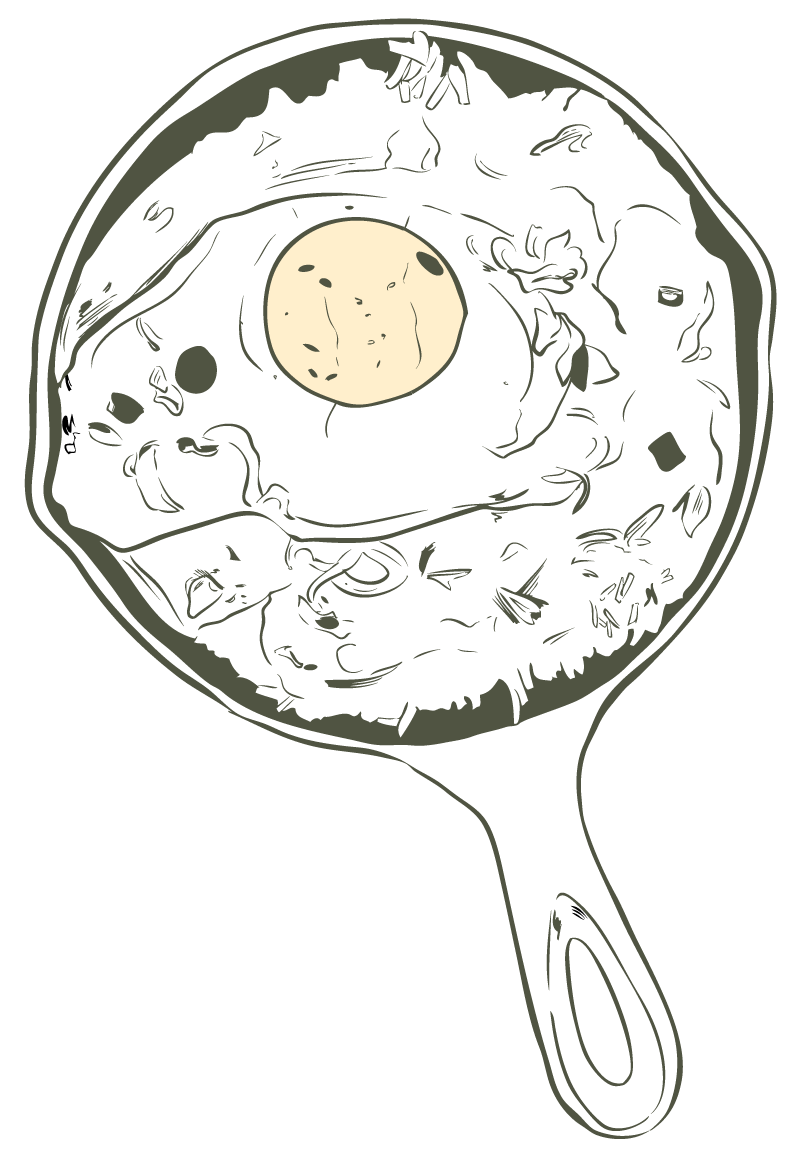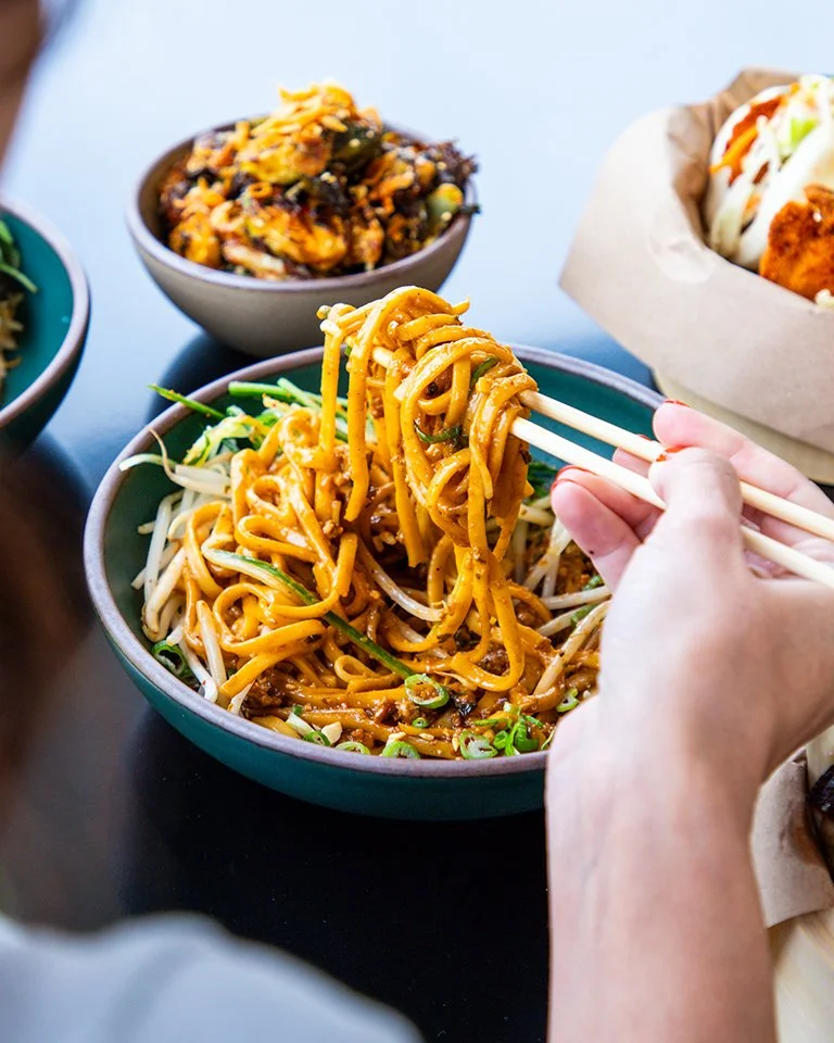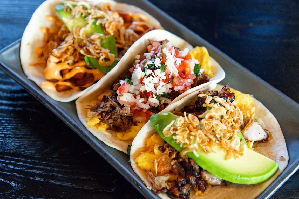 Certainly! Our menu includes items like BBQ brisket and banh mi tacos, kimchi arancini balls, dan dan noodles, southern fun, chicken katsu curry, Korean steak & eggs, brisket hash, and more.